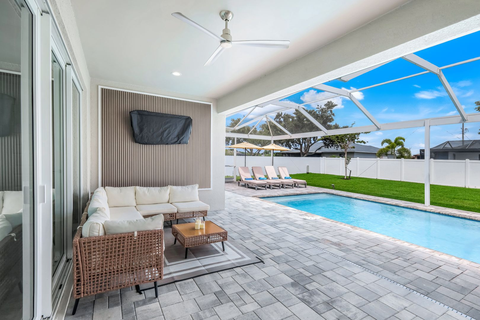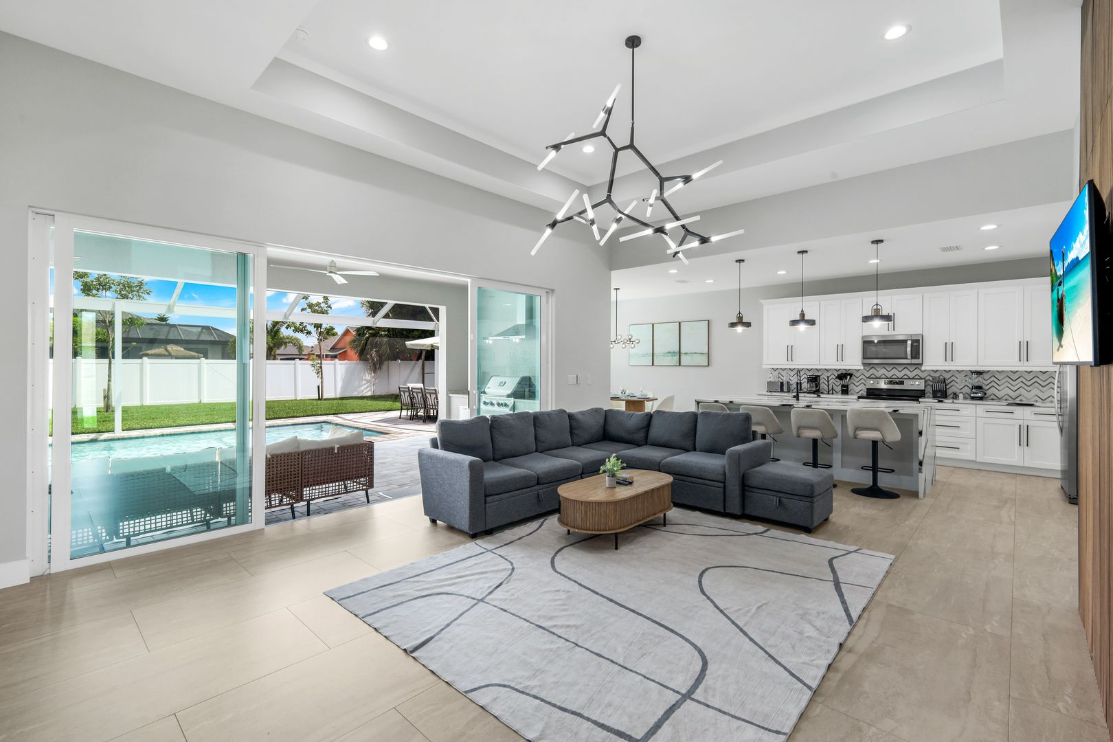 A shimmering pool is perfect for a refreshing dip any time of year. The spacious lanai is your central hub for relaxation and entertainment, complete with a BBQ grill and a flat-screen TV for unforgettable movie nights under the stars.