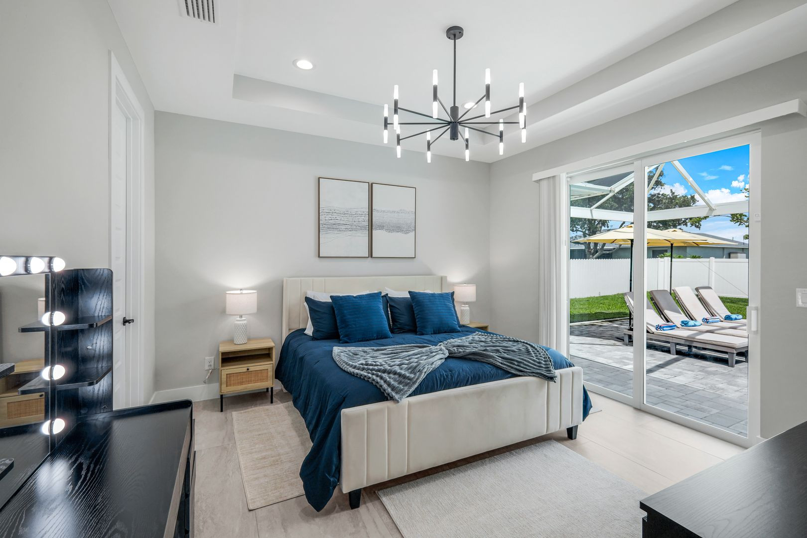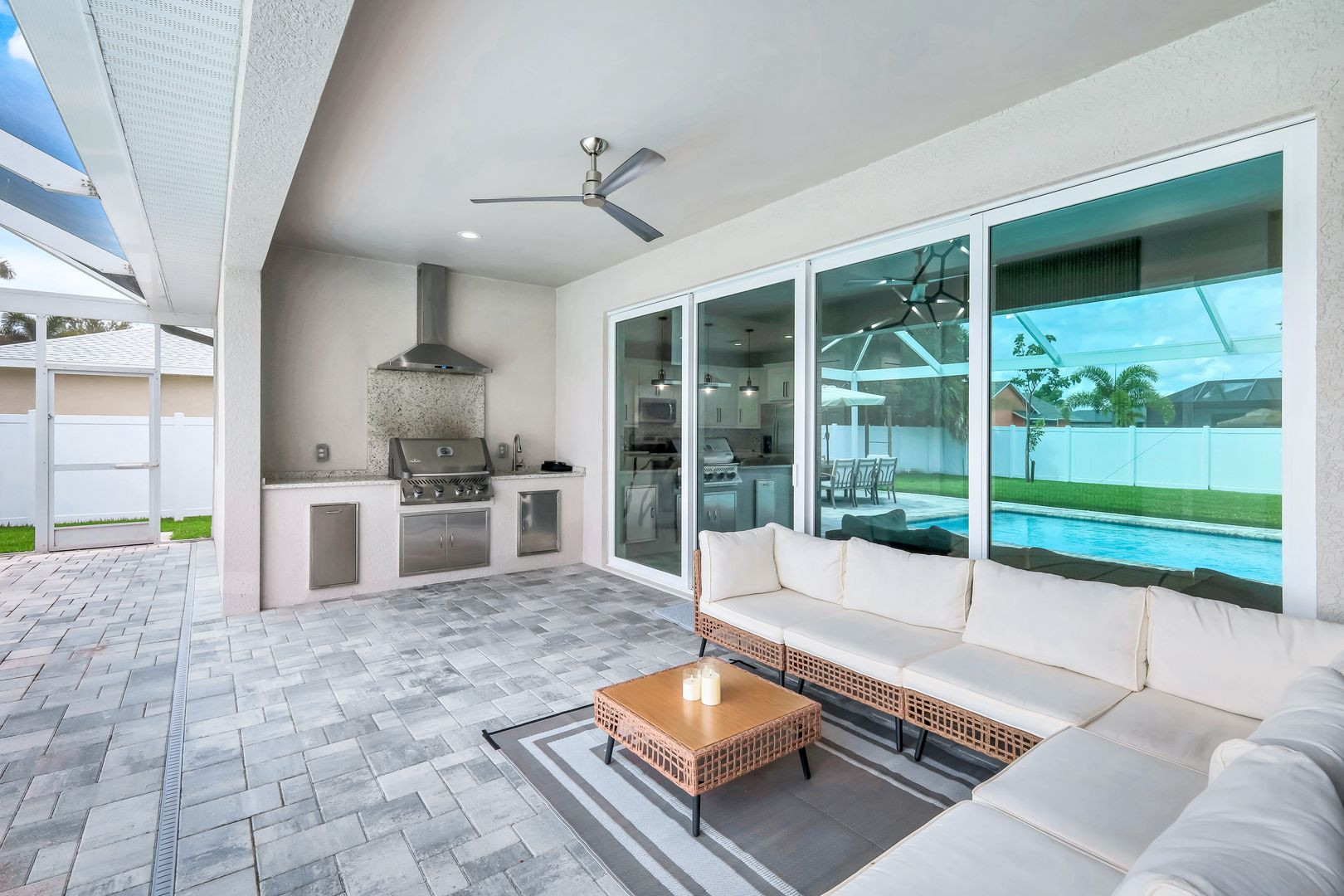 With three cozy bedrooms and 2.5 stylish bathrooms, there's plenty of room for everyone to spread out and relax. The open living area is perfect for socializing, while the fully equipped gourmet kitchen and fantastic outdoor kitchen invite you to unleash your inner chef.